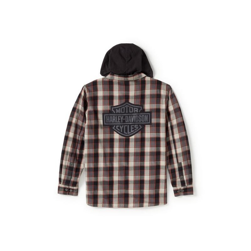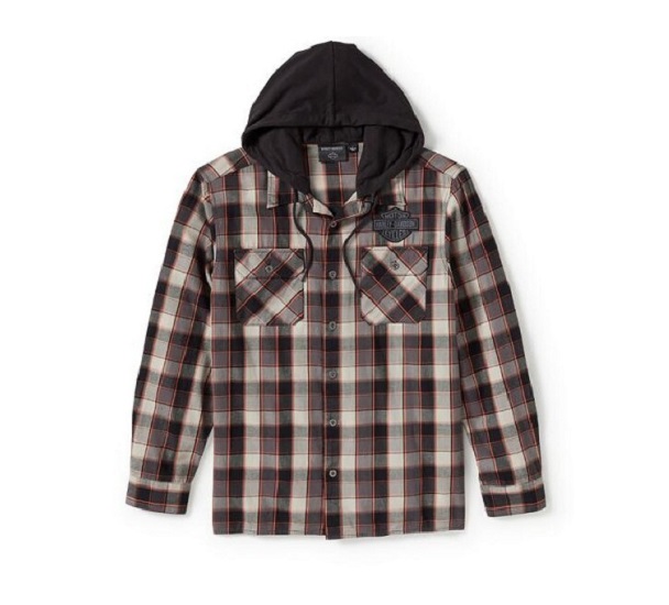 produkt oryginalnyKoszula została wykonana z bawełny. Posiada na plecach duże logo ,,Harley-Davidson Cycles”. Koszula ma długi rękaw, dwie kieszenie na piersi z klapakami i guziki na całej długości. Kaptur wykonany jest z ciemnego materiału, co kontrastuje z resztą ubrania.