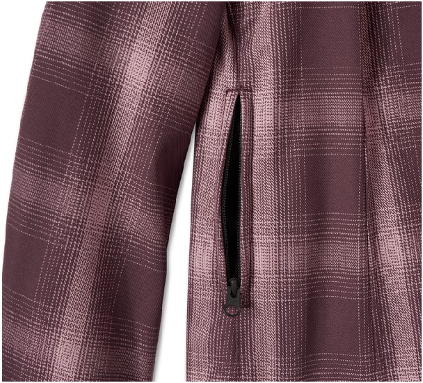 Posiada również zapinaną na zamek prawą kieszeń, aby zabezpieczyć niezbędne rzeczy. Kurtka ma ponadczasowy wzór w kratę z minimalnym brandingiem z przodu i charakterystycznym brandingiem oraz inspirowaną kwiatami grafiką wyhaftowaną z tyłu.