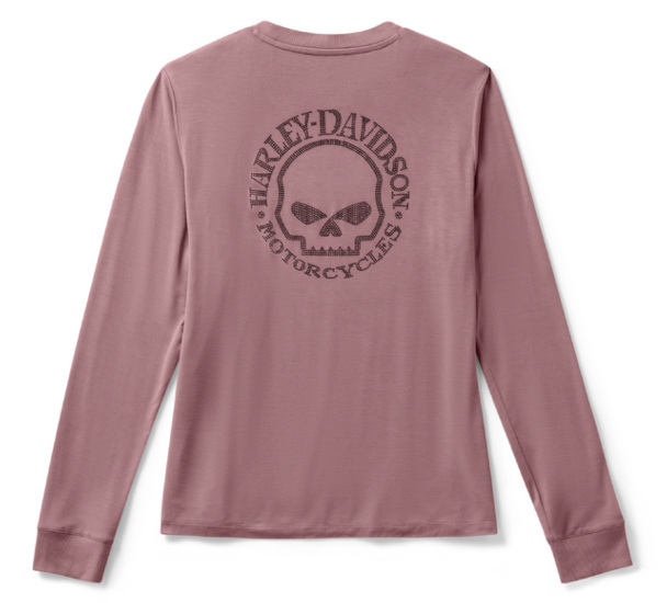 produkt oryginalnyDamski longsleeve łączący w sobie klasyczny motocyklowy charakter wraz z kobiecą wygodą i subtelnym stylem. Inspirowany kultową grafiką stworzoną przez legendarnego Willie G. Davidsona. Longsleeve o lekko dopasowanym kroju, dobrze układającym się na sylwetce. Na przodzie znajduje się niewielka grafika Willie G skull, natomiast na plecach widnieje logo HARLEY-DAVIDSON MOTORCYCLES wraz z charakterystyczną czachą. Rękaw ozdobiony jest również subtelnymi kryształkami z nazwą marki, które delikatnie połyskują w świetle.
